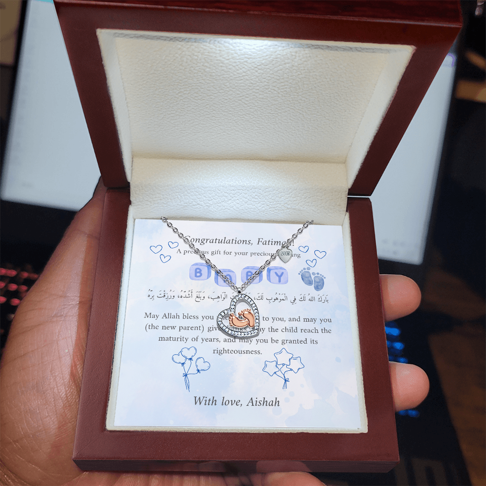 To make your gift even more meaningful, the necklace comes with a customizable gift card where you can add your own “To” and “From” names, along with a heartfelt dua for the new parent; all you need to do is to write "To: Fatimah, From: Aishah", and we will make sure to add your desired names (the words "to" and "from" will not be added). This personal touch makes it the ideal choice for aqeeqah or new mom gifts.