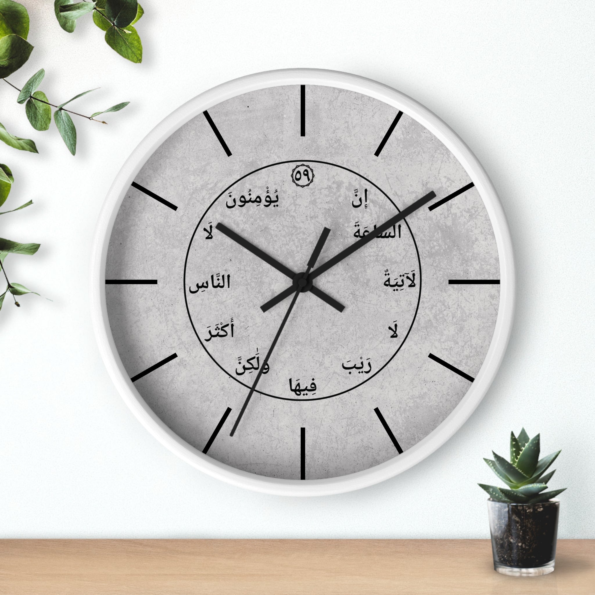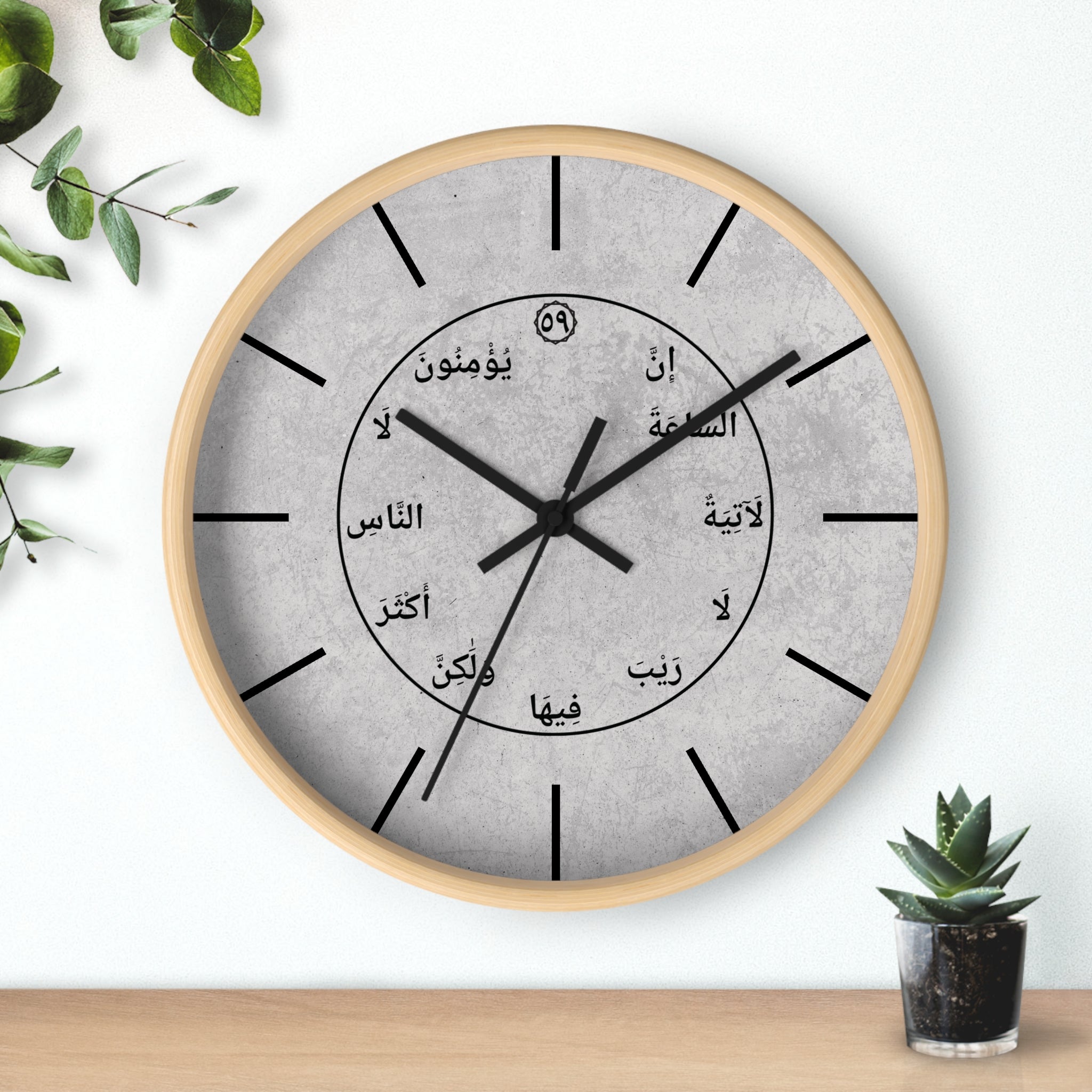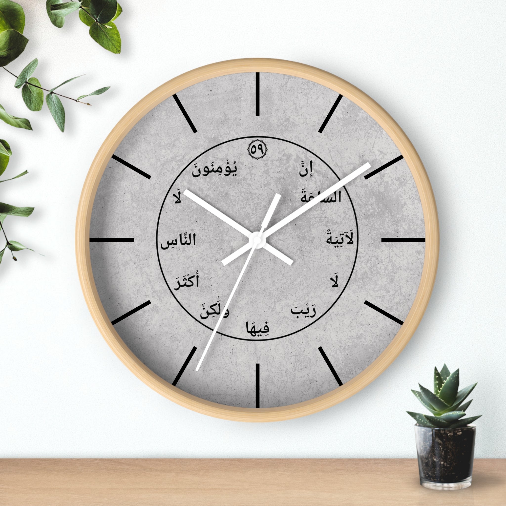 Add a meaningful touch to your home with this Islamic wall clock, featuring Qur'an verse 40:59 written in Arabic. This verse is a powerful reminder: "Indeed, the Hour is coming – no doubt about it – but most of the people do not believe." The design highlights the inevitability of the Day of Judgment and reminds us that this dunya (world) is temporary. This elegant clock is not just a timekeeper but a profound reminder of life's true purpose. The minimalist design complements any modern or traditional setting making it an inspiring piece of decor for your living room, bedroom, or office.